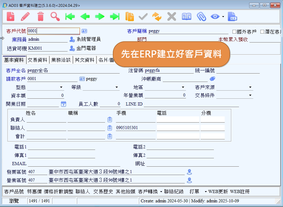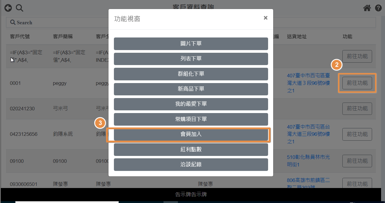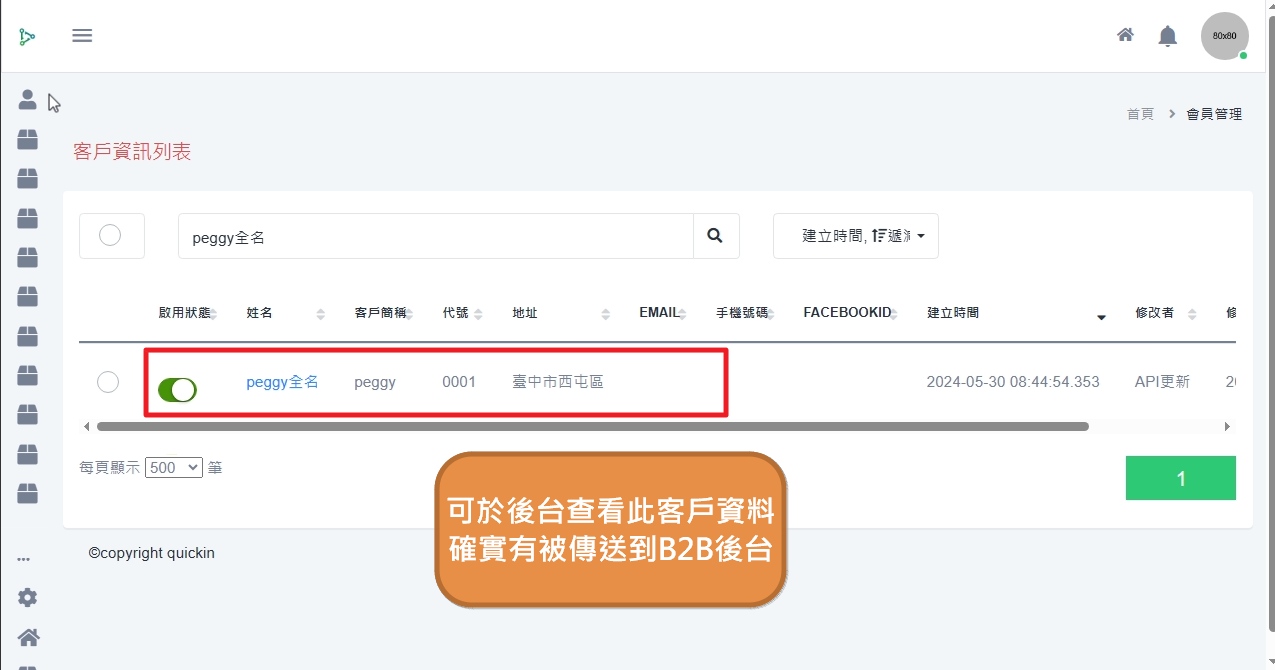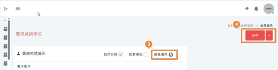 B2C與POS會員管理 使用說明 狀況題 影音教學 B2B會員加入流程說明一、首先需要在ERP中先建立好該客戶的資料二、再透過【容器】上傳至B2B後台三、接著回到後台查看是否有該客戶資料四、回到前台加入會員 ①登入前台後,點選客戶資料。 ②點選前往功能。 ③點選會員加入。 ④讓客戶掃描QRcode或是傳送連結給客戶,加入會員。 五、到後台設定會員權限 ①登入後台後,會員管理-->會員資訊。 ②點選欲設定的會員。 ③將最高權限打勾。 ④最後點選保存即可。 ➪資料保存後,會跳出下圖視窗,代表資料已修改成功