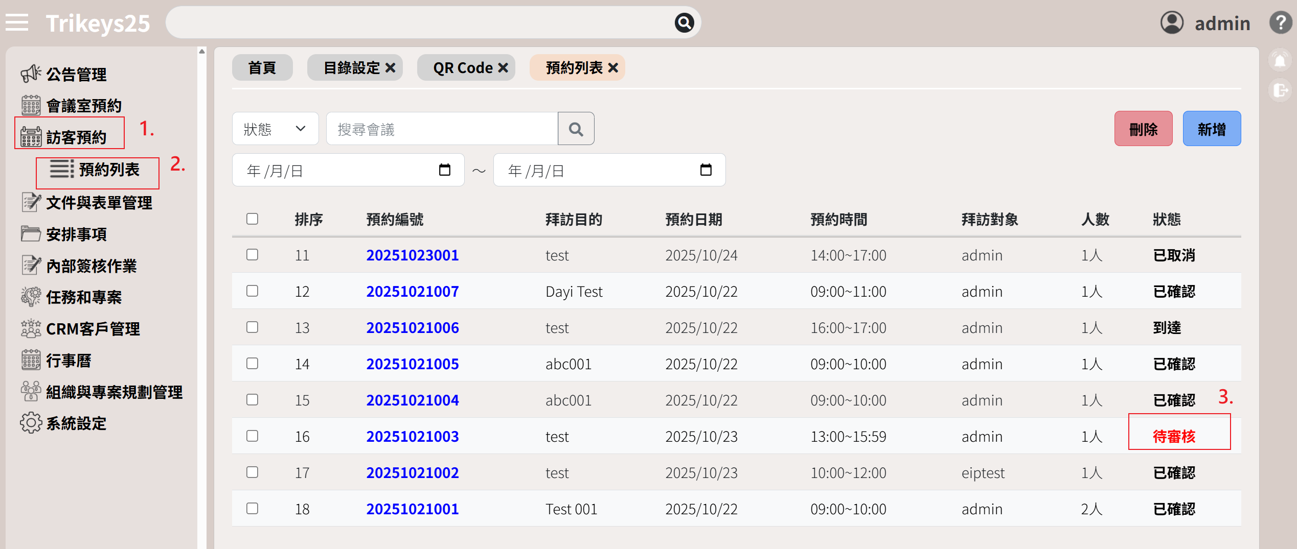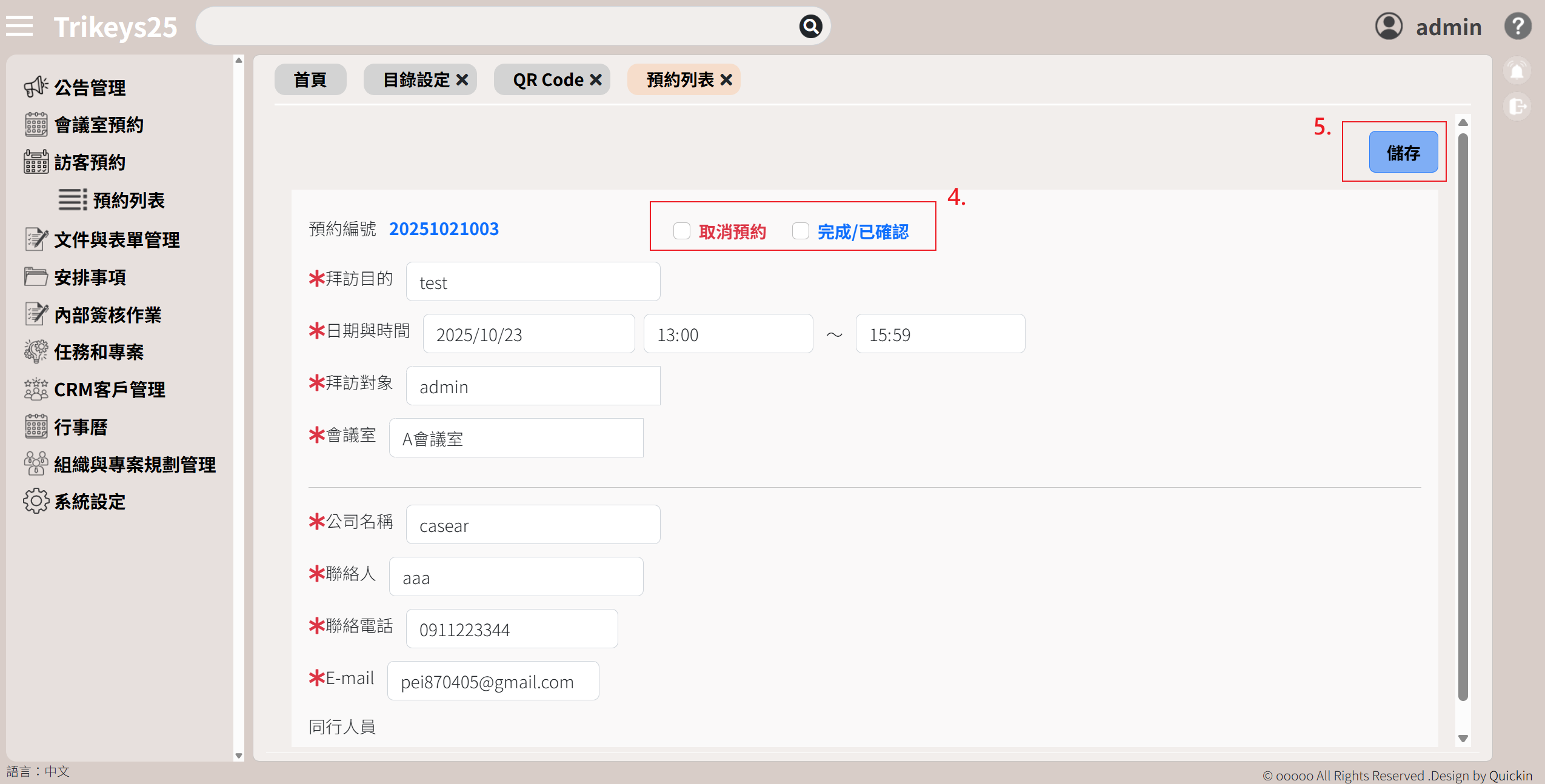 EIP簽核模組訪客預約預約列表 使用說明 狀況題 影音教學 訪客預約列表◆ 給外部人員預約| 操作步驟 |1. 點選系統設定2. 點選QR Code3. 點選C - Booking4. 點選複製QR Code或URL5. 輸入內容及新增同行人員6. 點選申請◆ 內部人員確認會議室預約| 操作步驟 |1. 點選訪客預約2. 點選預約列表3. 點選會議主題名稱(藍色字)4. 勾選取消或確認5. 點選儲存
