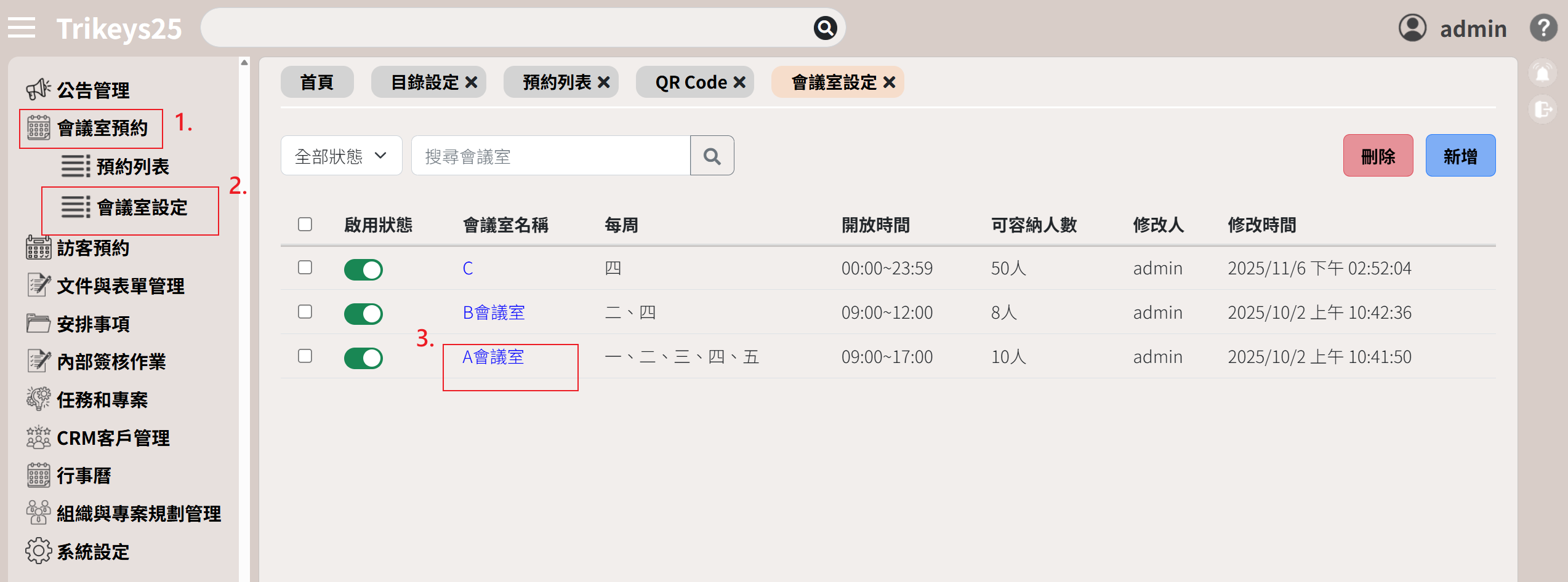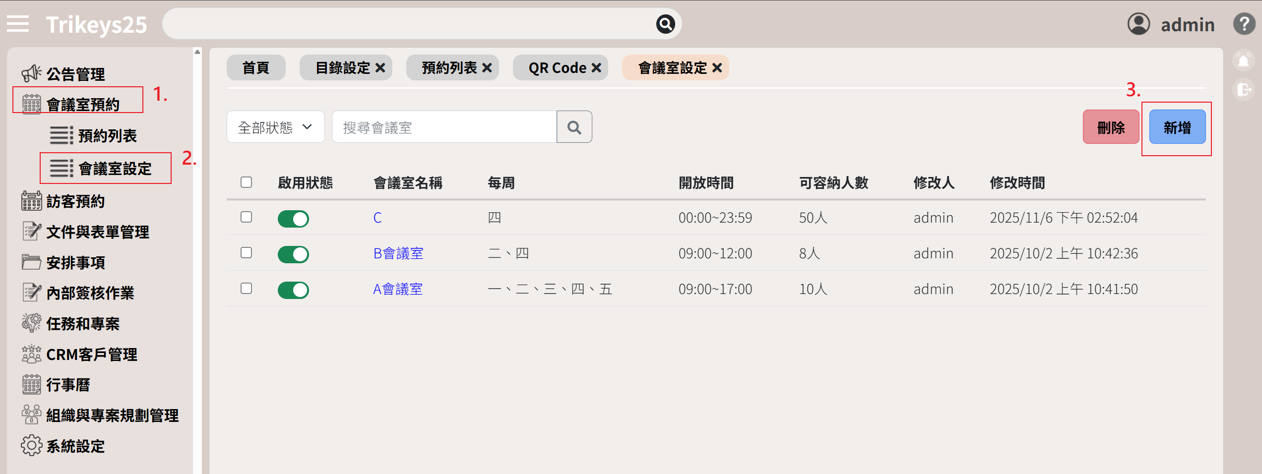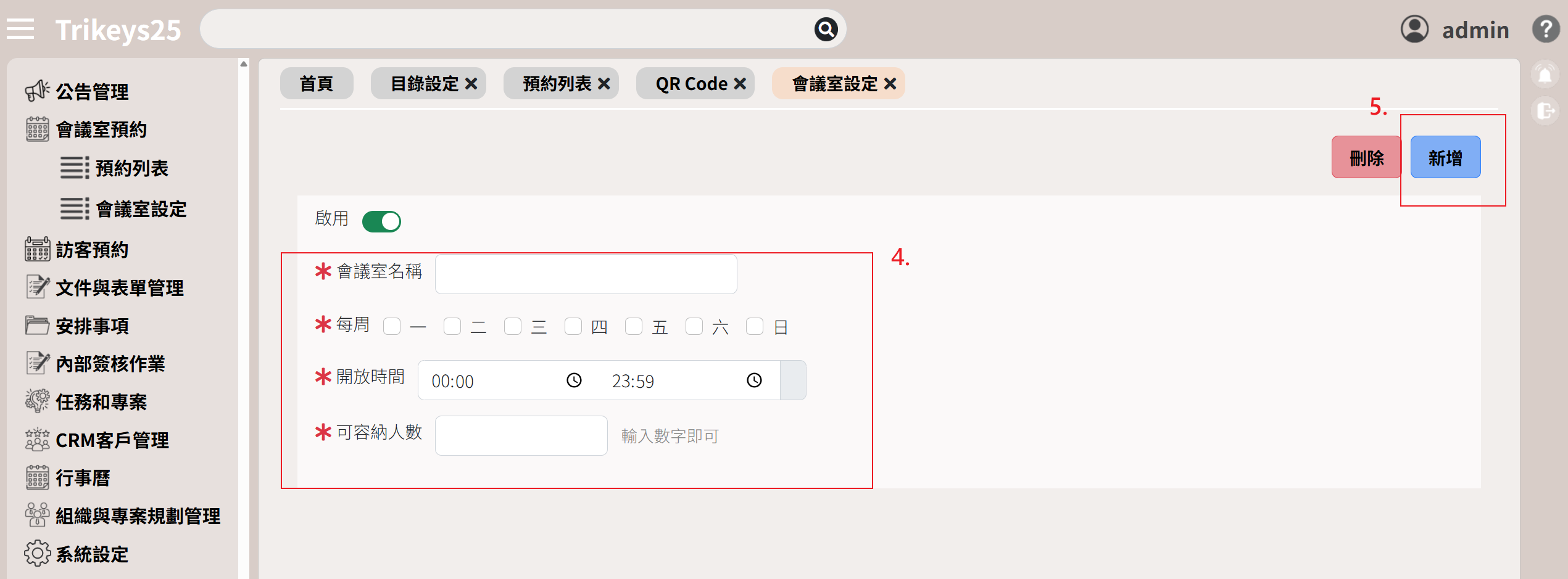 EIP簽核模組會議室預約會議室設定 使用說明 狀況題 影音教學 會議室設定◆ 新增會議室可預約的時間及容納人數| 操作步驟 |1. 點選會議室預約2. 點選會議室設定3. 點選新增4. 輸入會議室名稱、開放時間、容納人數5. 點選新增◆ 編輯會議室設定| 操作步驟 |1. 點選會議室預約2. 點選會議室設定3. 點選會議主題名稱(藍色字)4. 勾選取消或確認5. 點選儲存