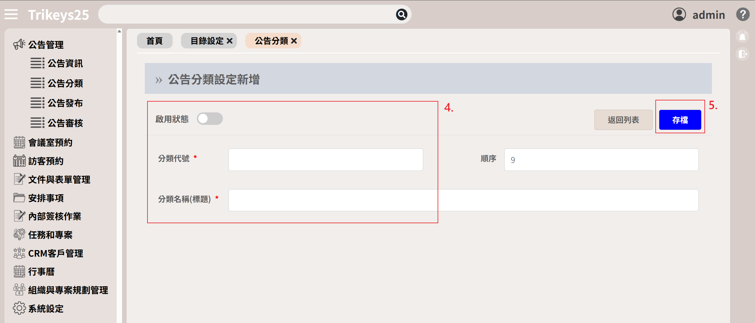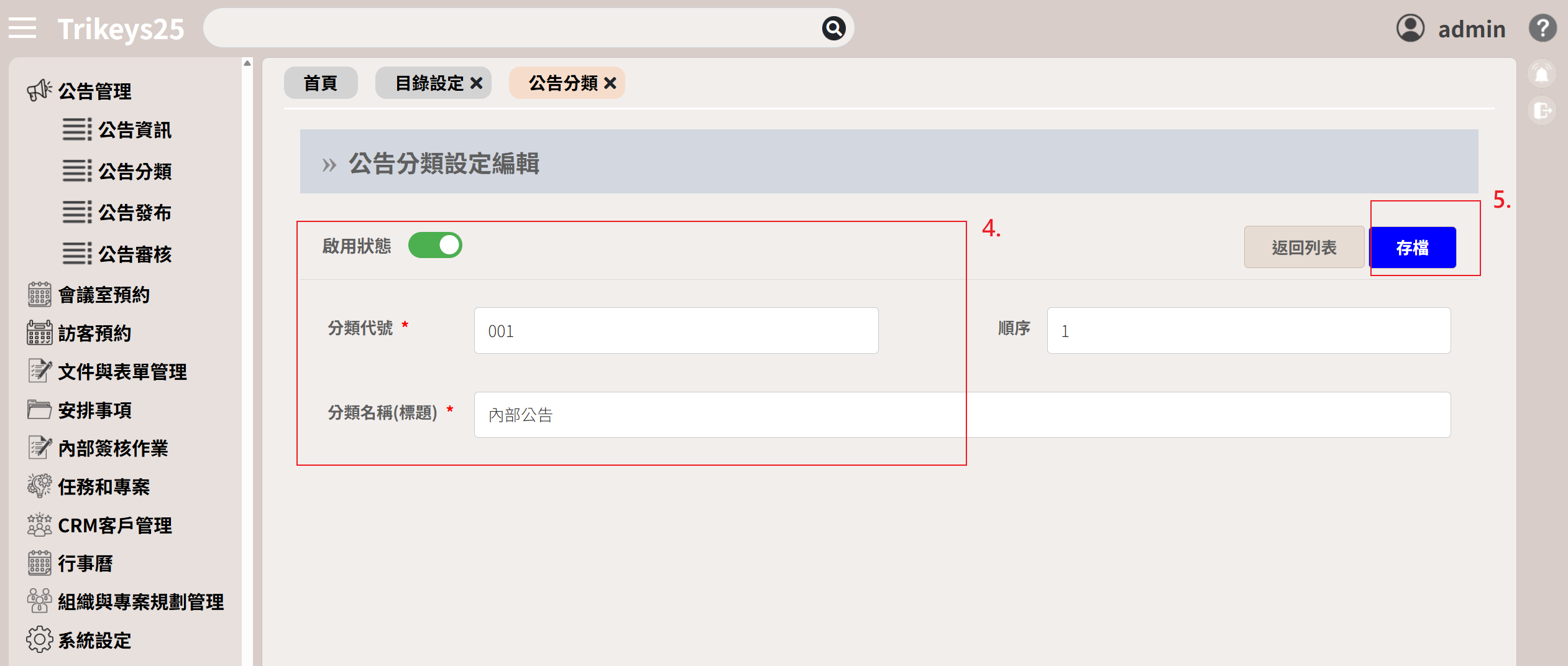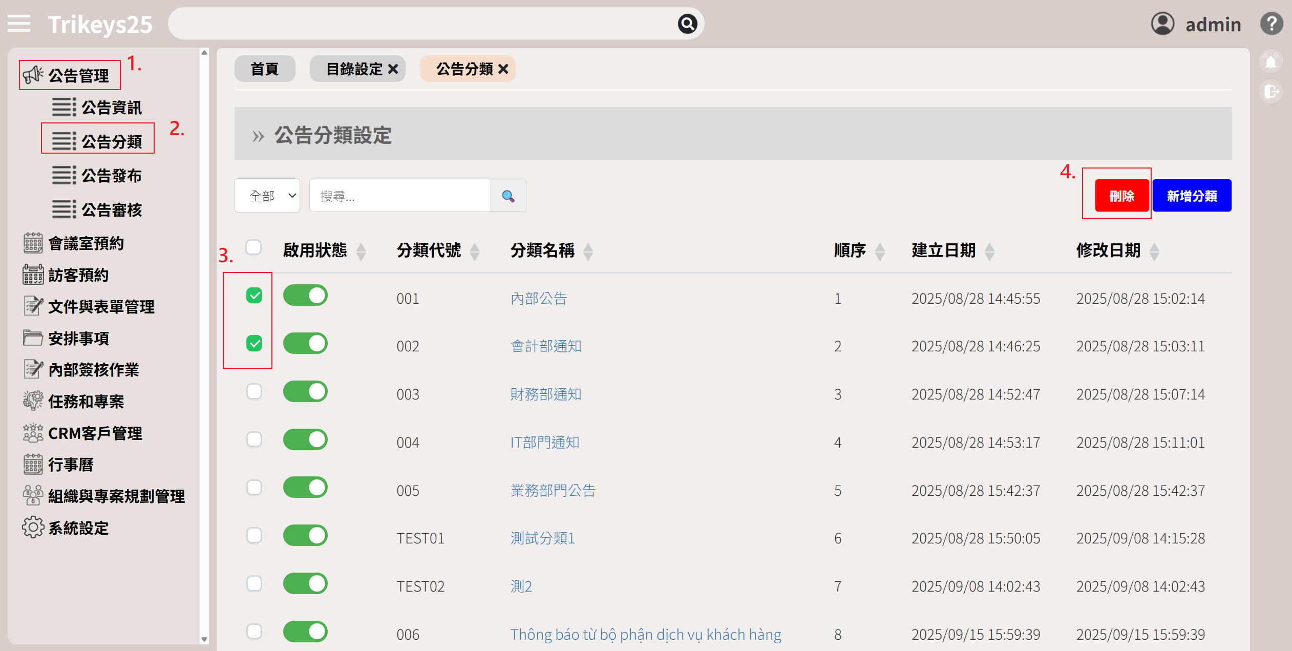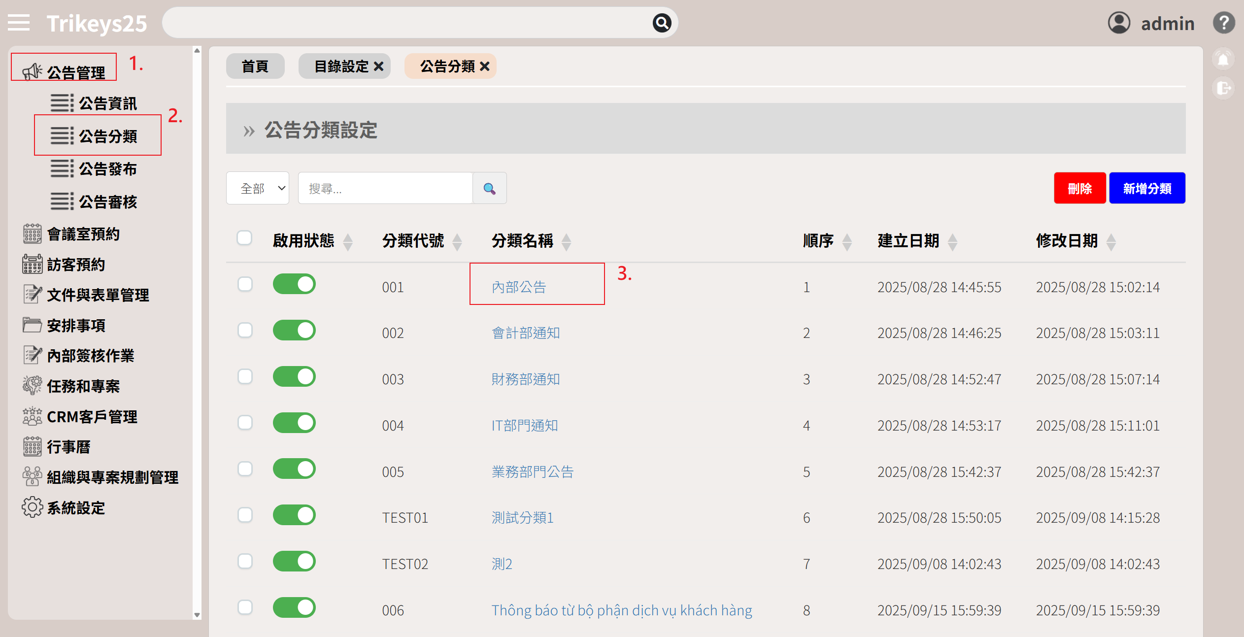 EIP簽核模組公告管理公告分類 使用說明 狀況題 影音教學 公告分類◆ 新增的公告分類可在公告資訊的左側點選類別| 操作步驟 |1. 點選公告管理2. 點選公告分類3. 點選新增分類4. 開啟啟用狀態並輸入分類代號、分類名稱5. 存檔◆ 編輯公告分類| 操作步驟 |1. 點選公告管理2. 點選公告分類3. 點選分類名稱(藍色字)4. 輸入要修改的內容5. 存檔◆ 刪除公告分類| 操作步驟 |1. 點選公告管理2. 點選公告分類3. 勾選要刪除的分類4. 點選刪除
