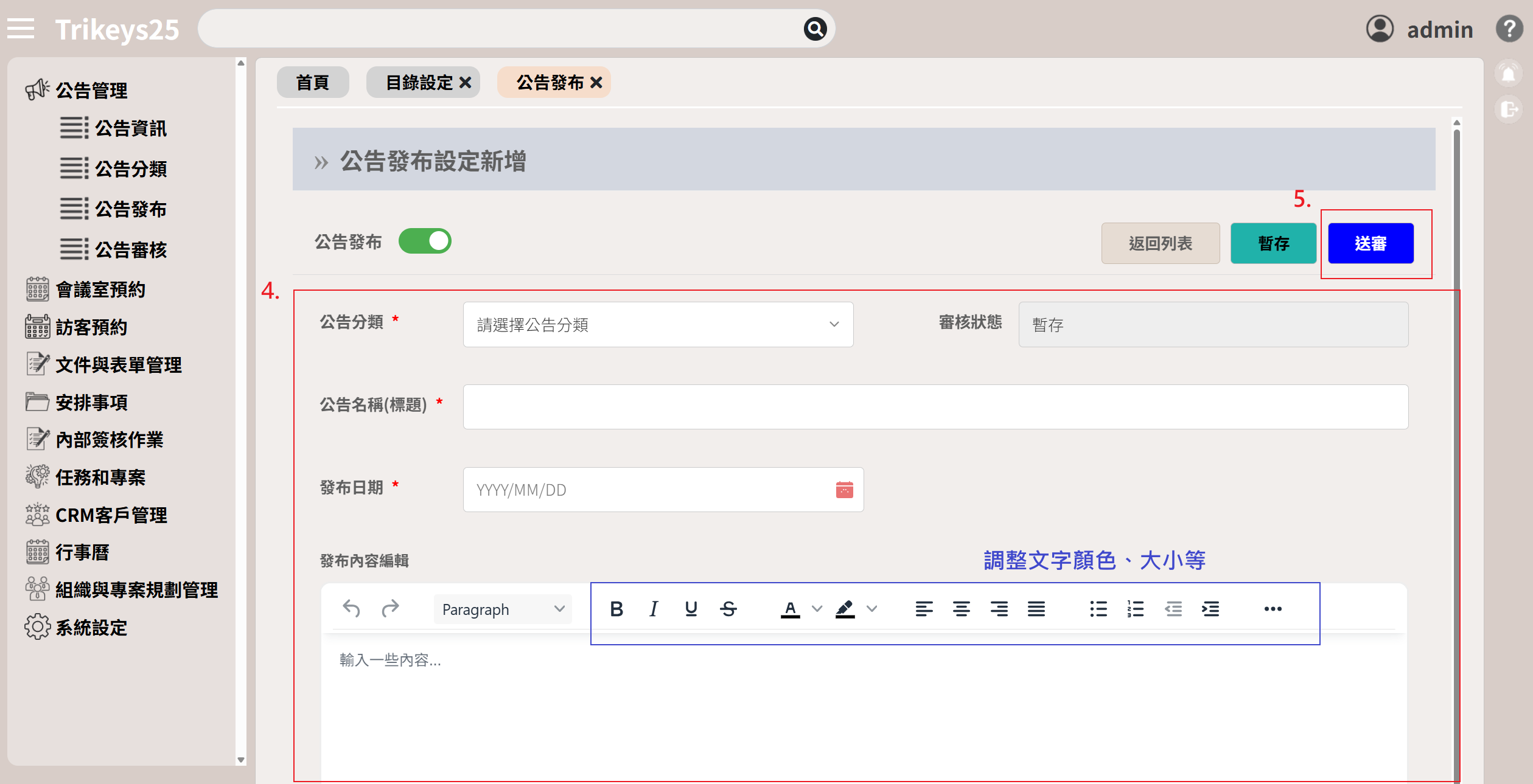 4. 選擇公告分類、輸入公告標題、選擇發布日期,公告內容可自行編輯顏色、字體、大小等排版