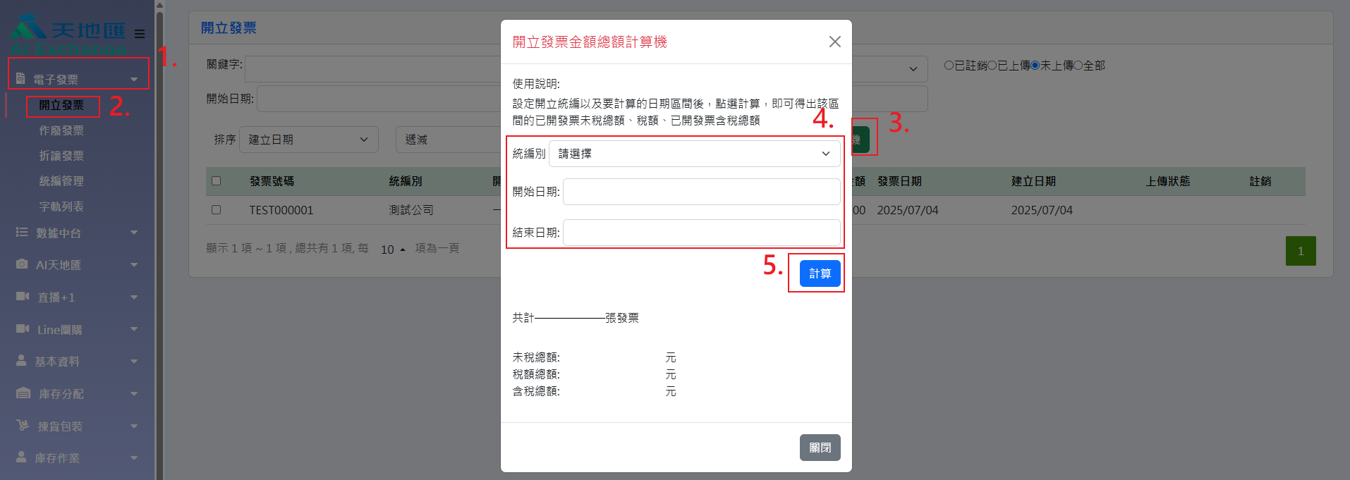 ◆ 開立發票金額總額計算機 - 可計算設定區間內的發票總數及總額。