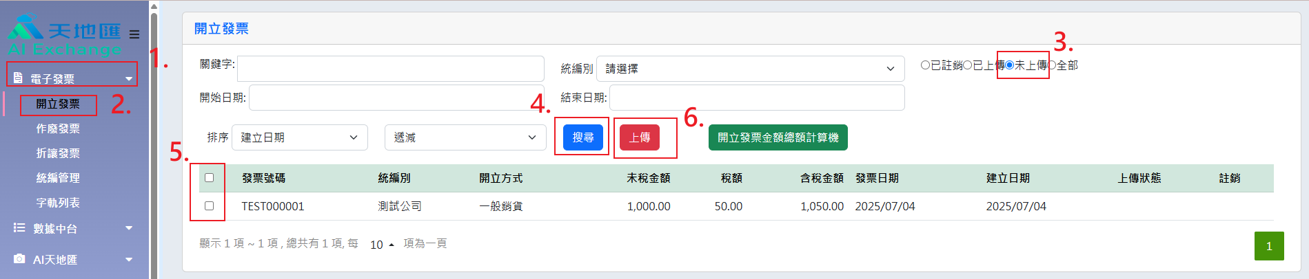 ◆ 上傳 - 可上傳尚未上傳的已開立發票。