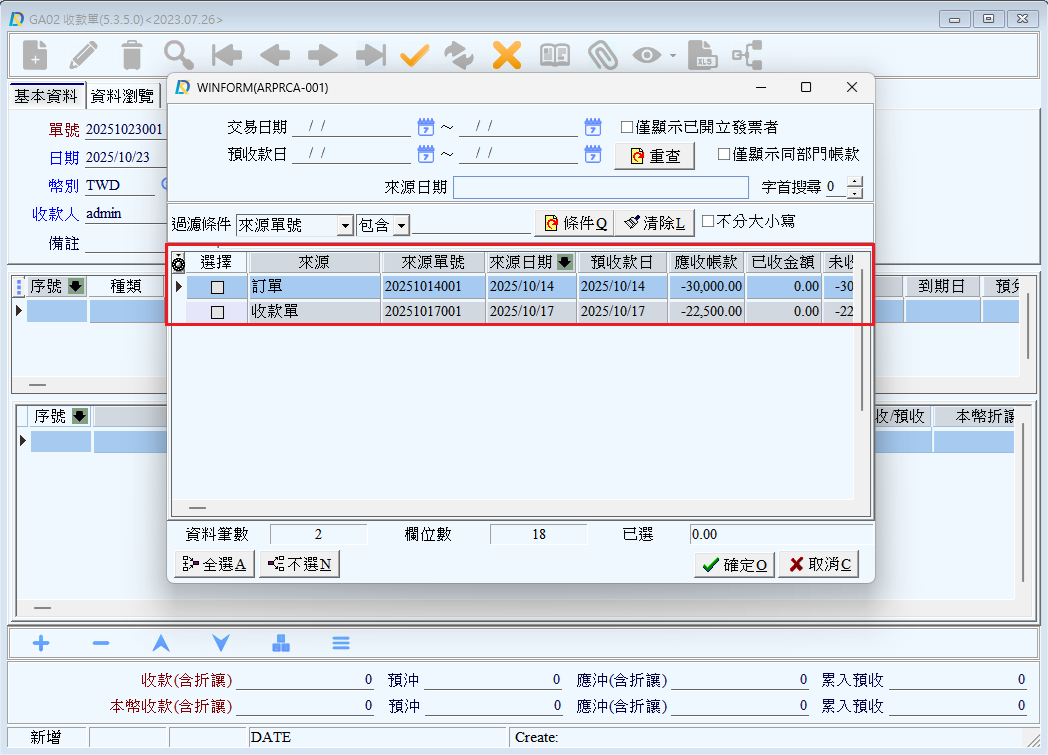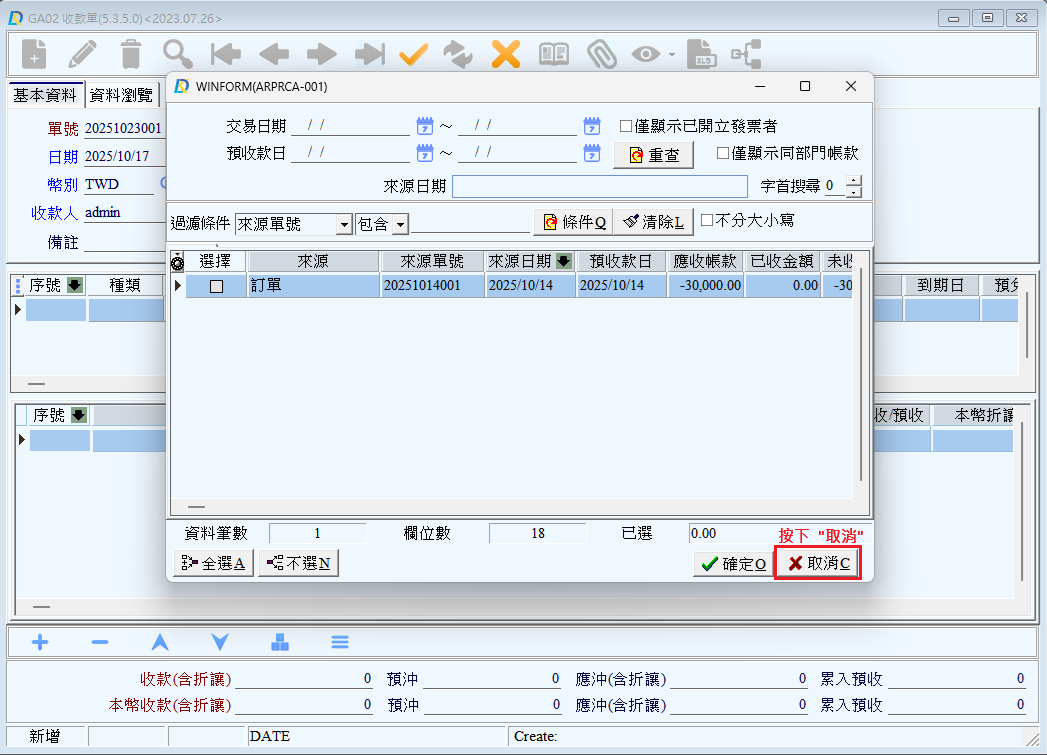 」選取前置單據。