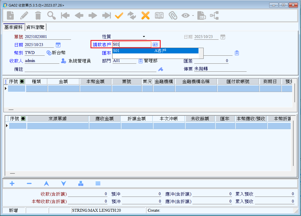 ●發票聯式、課稅別、公司統編、開立方式、發票抬頭:客戶的基本資料中已設定,則系統會自動顯示,也可開窗做選取。