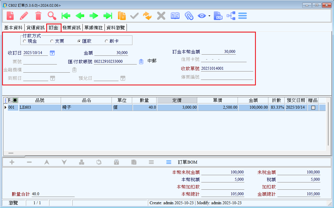 ●訂金本幣金額:為「訂金金額×匯率」,不可修改。