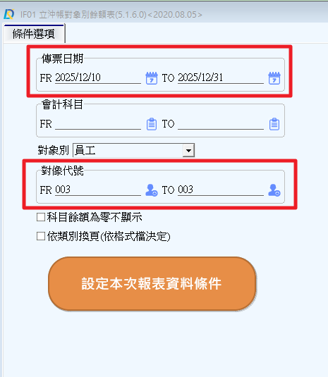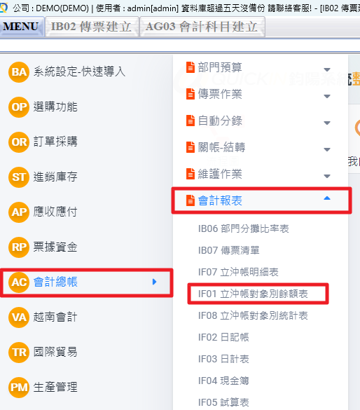 1.會計總帳→會計報表→立沖帳對象別餘額表