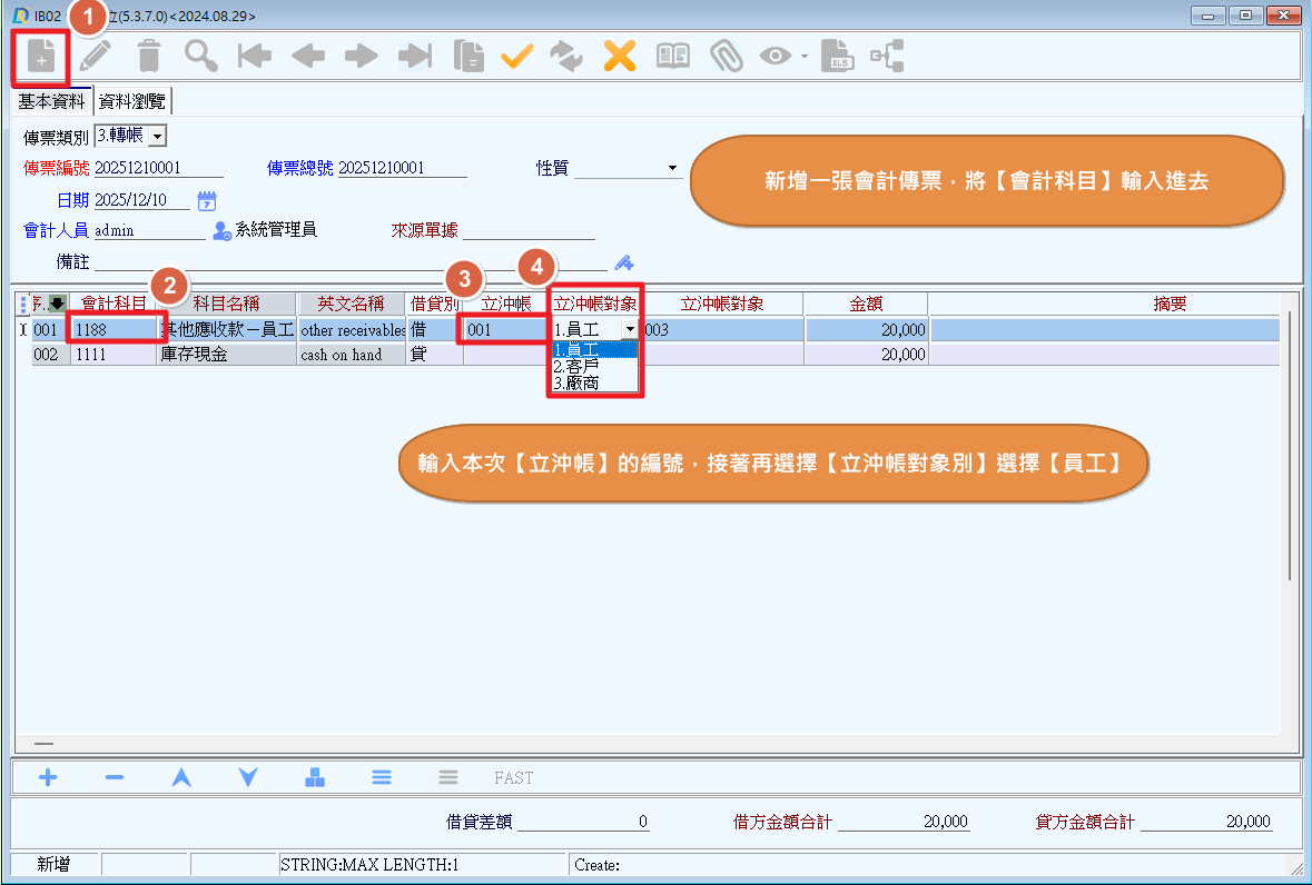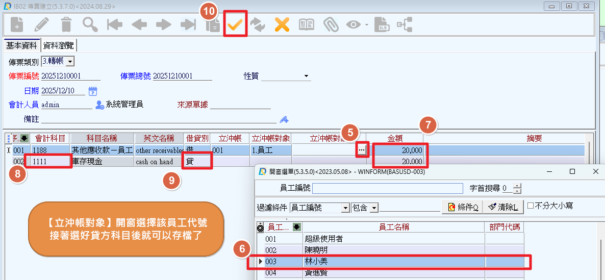 2.設定本次立沖帳之編號、對象別(員工),並帶入對象資料(林小美)