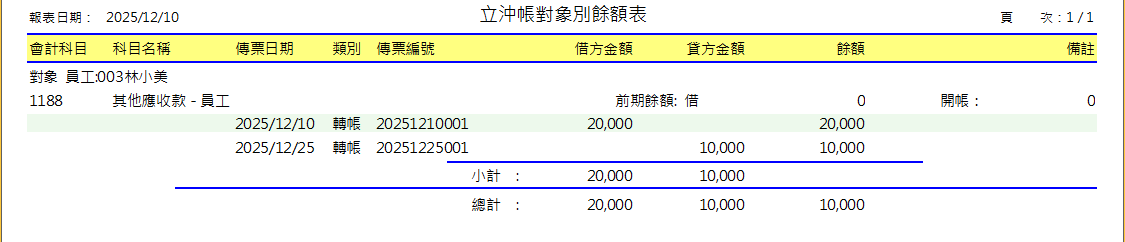 阿亮的員工林小美於 2025/12/10 因臨時需要,故向公司借款 20,000 元,公司先行以現金撥付給員工,並約定從薪資扣回。林小美額外提出,希望可以先還10,000元等之後再還剩下的款項。阿亮在系統上要如何記錄,並且查看報表呢?