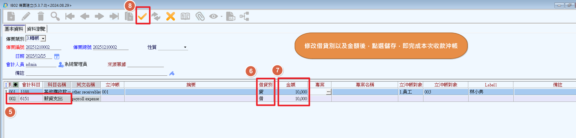 (2)系統會自動帶入「傳票類別」、「傳票編號」、「傳票總號」、「日期」、「會計人員」,不過都可以依照實際狀況進行修改。