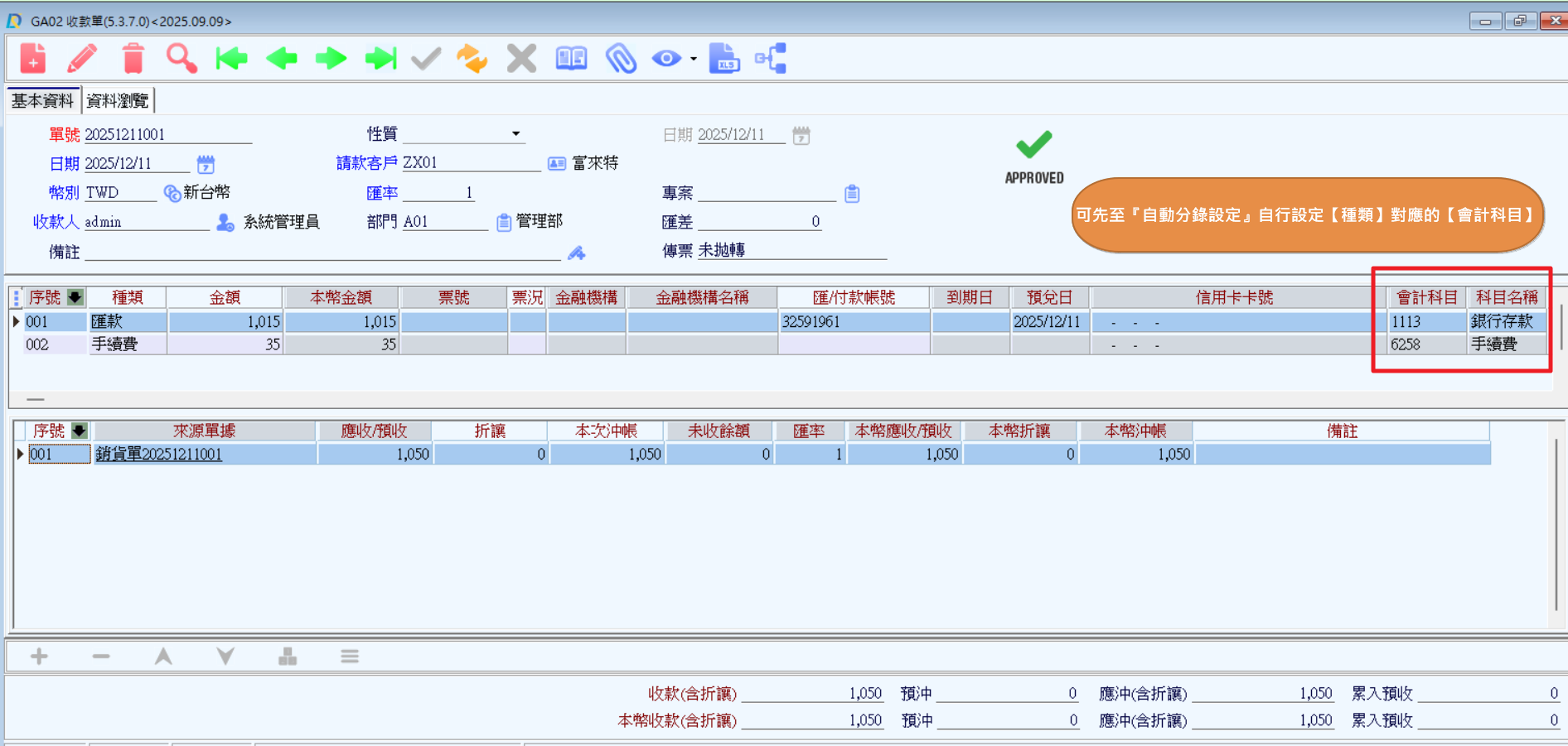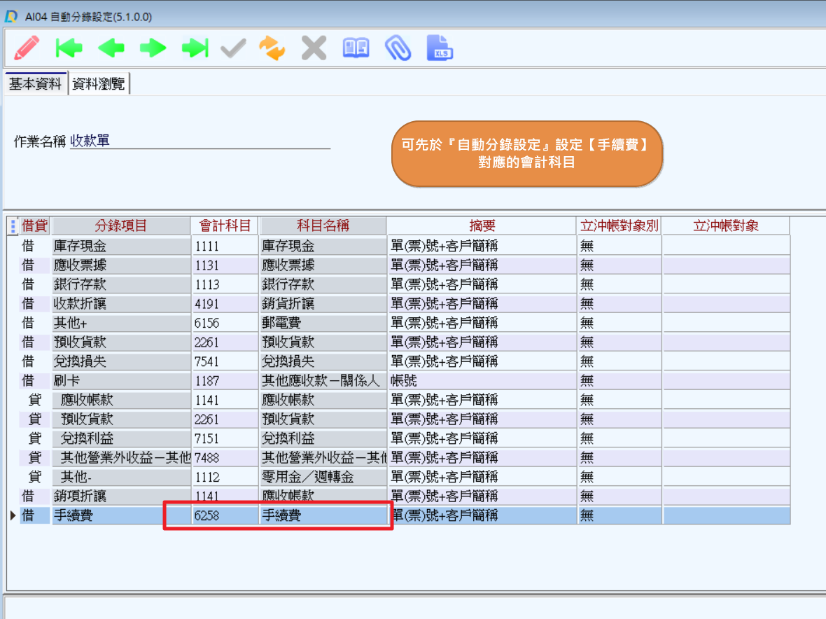 可以發現『收款單』在【會計科目】的地方會先有預設的科目,以便在拋轉傳票時不用每次都自行手動新增,那該如何建立呢?