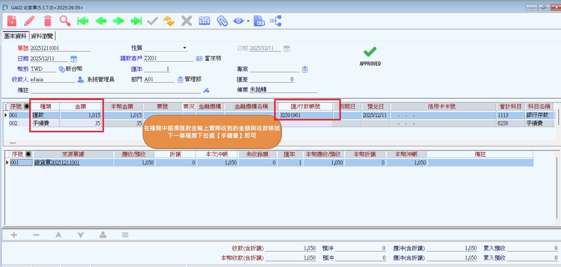 1.至應收應付->應收帳款->『收款單』選擇客戶後,帶入對應的『銷貨單』後【種類】選擇實際是哪一種方式收到款項的,輸入完實際收到的金額與相關資訊後,下一行【種類】選擇【手續費】後即可存檔
