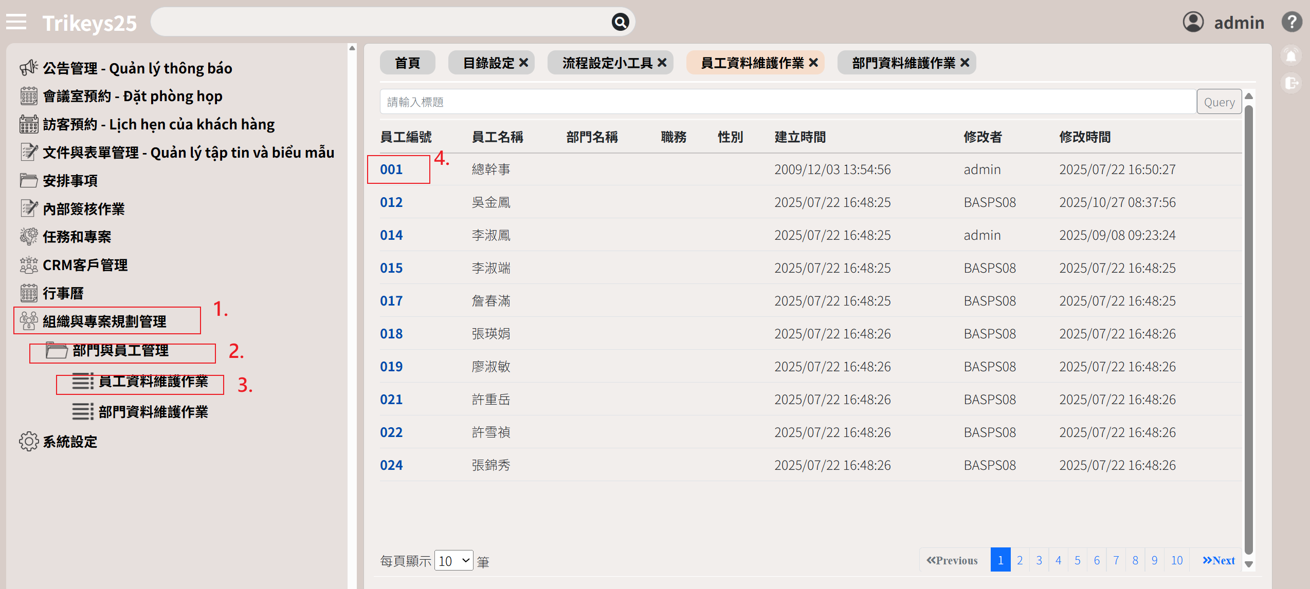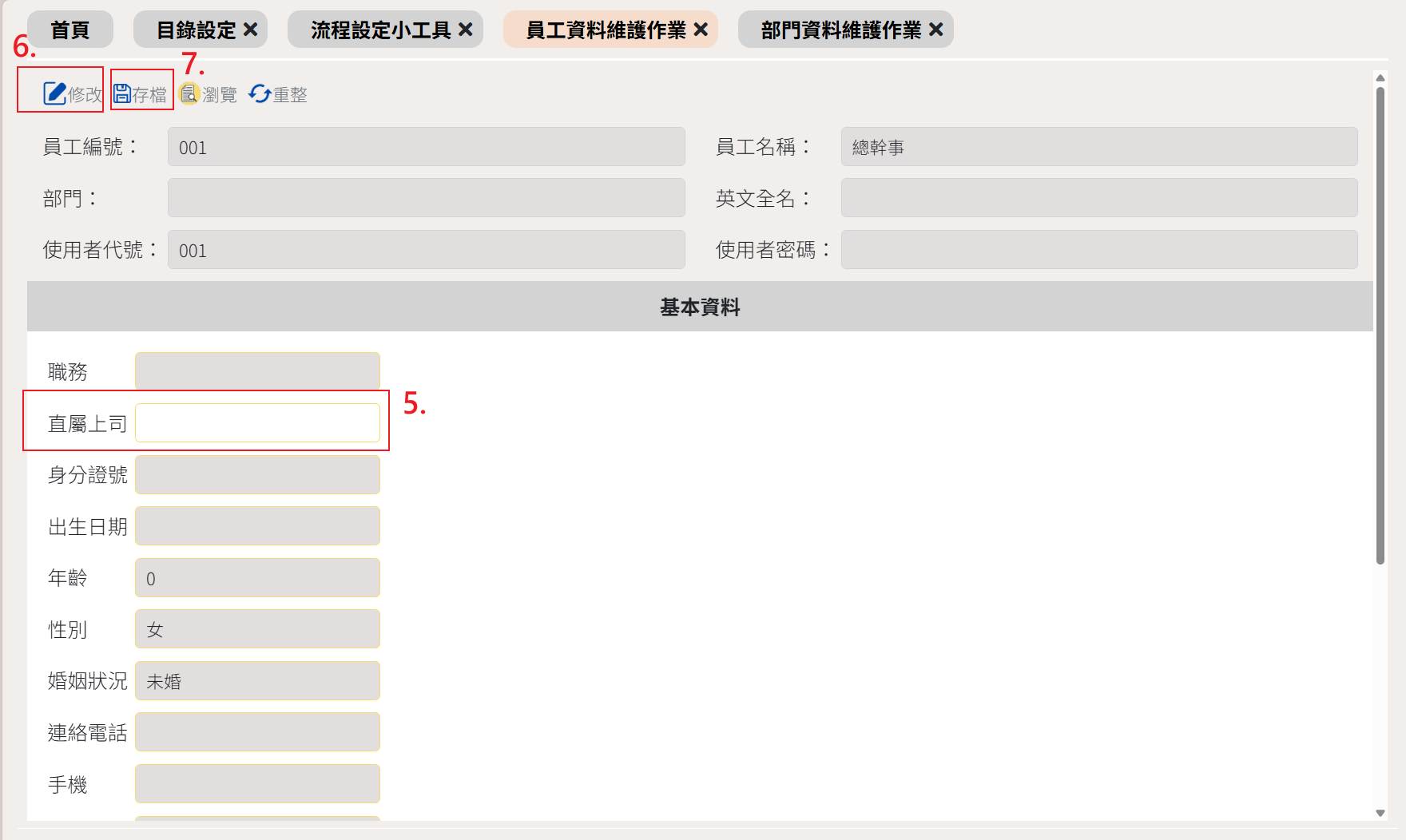 EIP簽核模組組織與專案規劃管理員工資料維護作業 使用說明 狀況題 影音教學 員工資料維護作業◆ 編輯員工直屬上司| 操作步驟 |1. 點選組織與專案規劃管理2. 點選部門與員工管理3. 點選員工資料維護作業4. 點選員工編號 (藍色字)5. 點選修改6. 輸入直屬上司7. 點選存檔