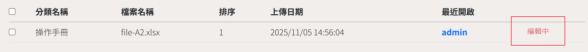 ※注意: 當有人員在修改文件時,非修改人員會顯示【編輯中】不能對該文件有任何操作,修改人員完成時需重新上傳文件,並重新審核。
