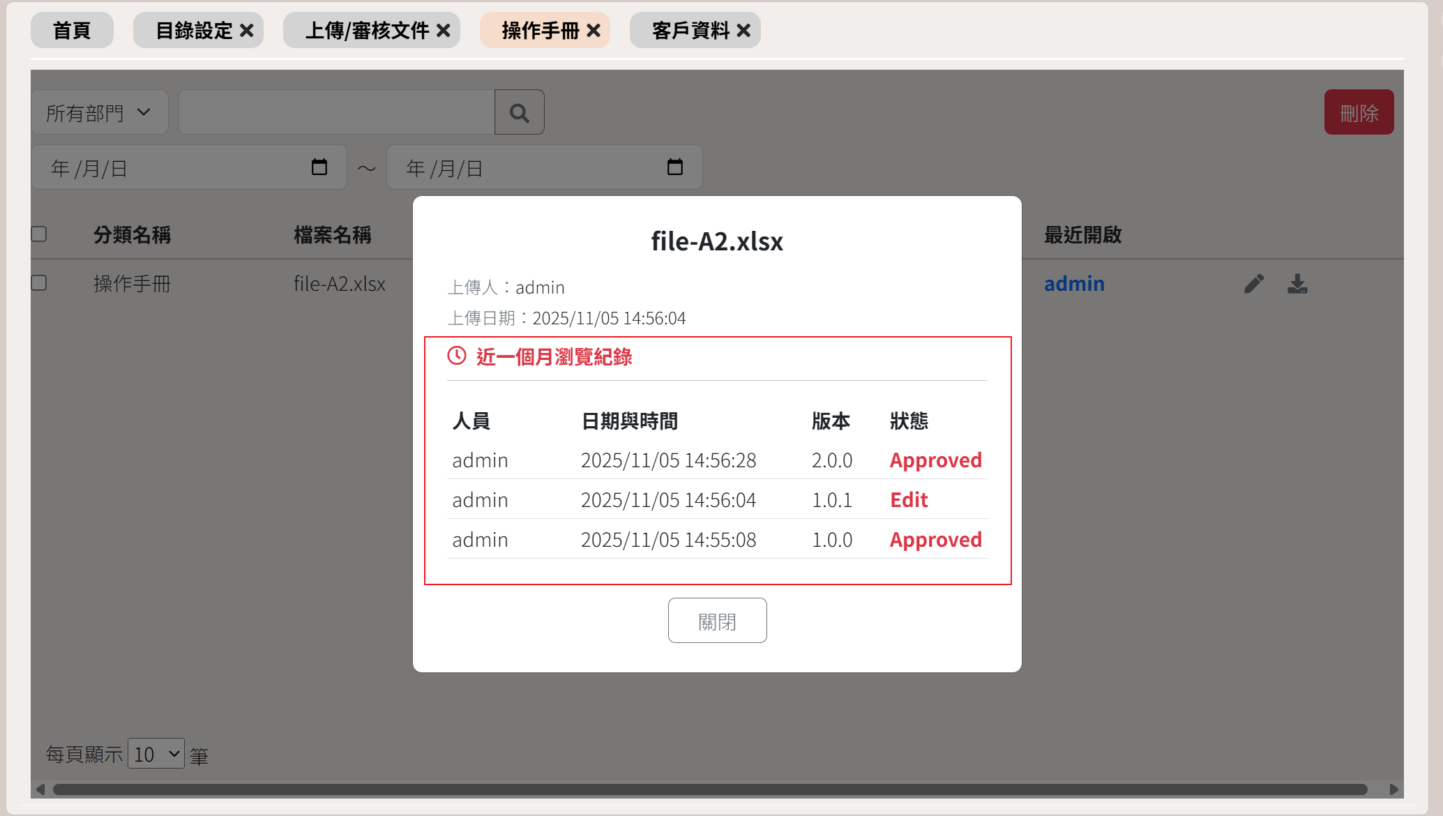 ◆ 查看該文件一個月內的員工操作狀態(如: 審核通過/修改/下載)