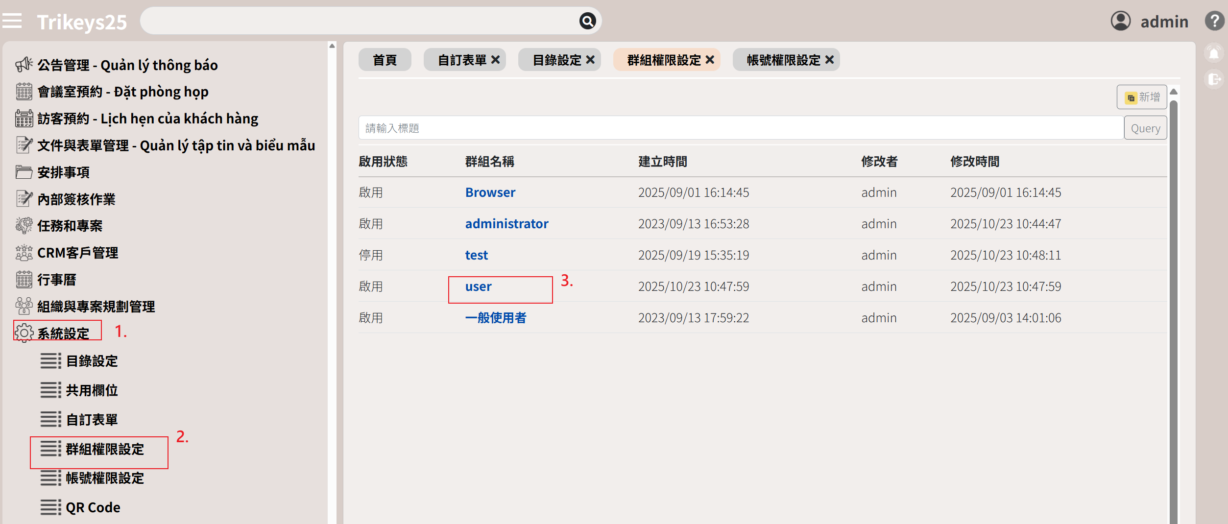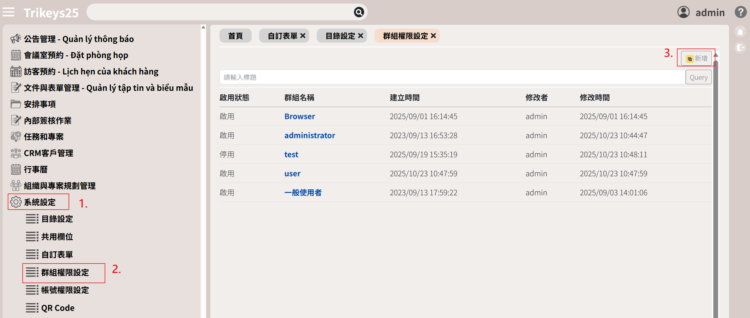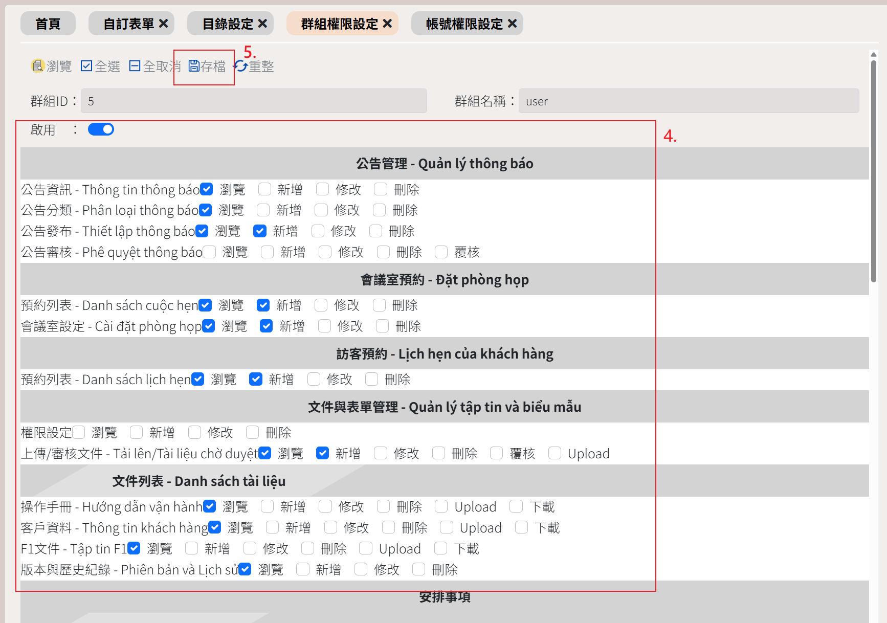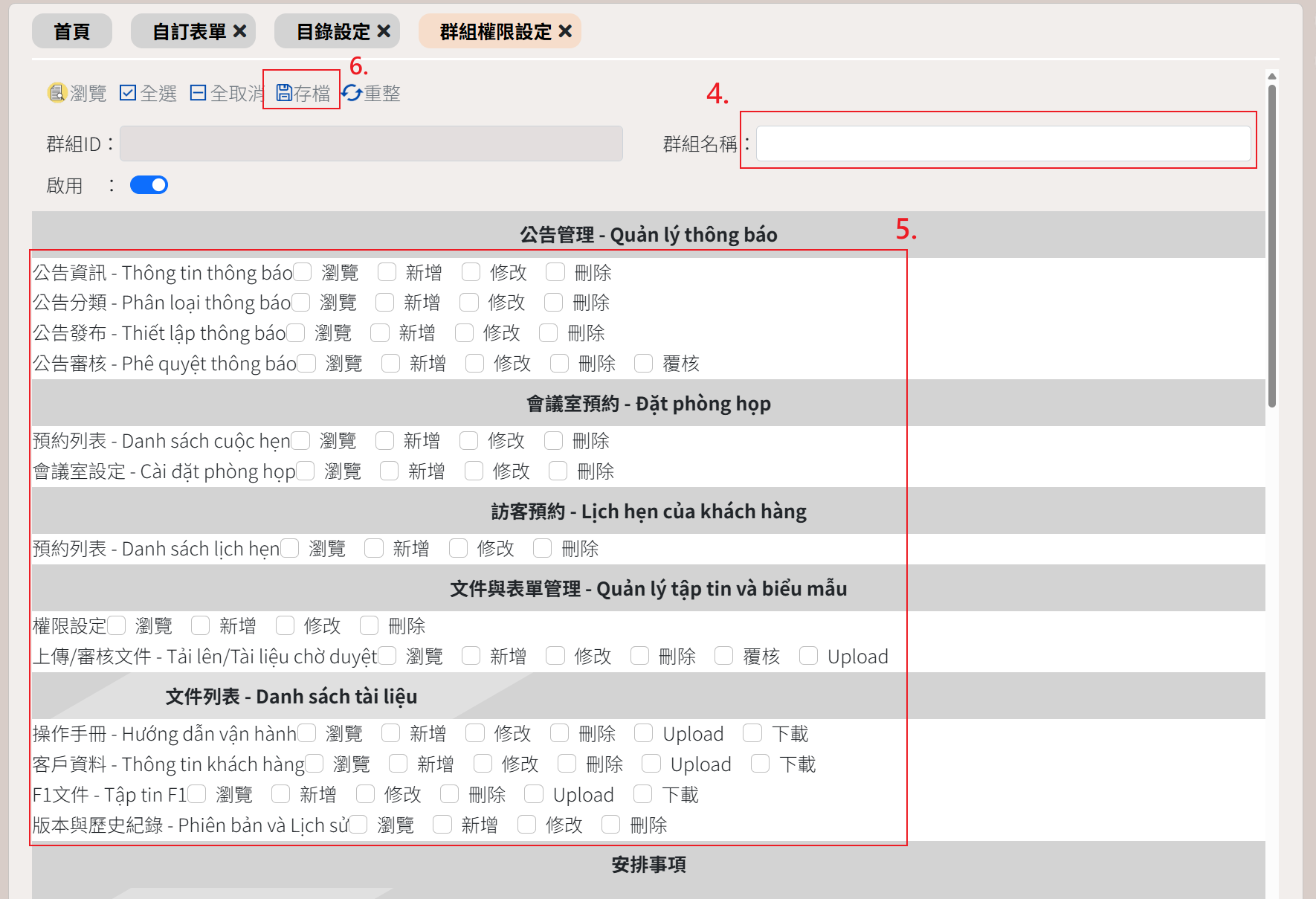 EIP簽核模組系統設定群組權限設定 使用說明 狀況題 影音教學 群組權限設定◆ 新增群組權限◆ 設定帳號權限時可直接帶入該群組的權限| 操作步驟 |1. 點選系統設定2. 點選群組權限設定3. 點選新增4. 輸入群組名稱5. 勾選操作權限6. 點選存檔◆ 編輯群組權限| 操作步驟 |1. 點選系統設定2. 點選群組權限設定3. 點選群組名稱 (藍色字)4. 修改操作權限5. 點選存檔功能說明瀏覽返回列表全選勾選全部權限全取消 取消勾選的權限存檔儲存重整畫面重新整理